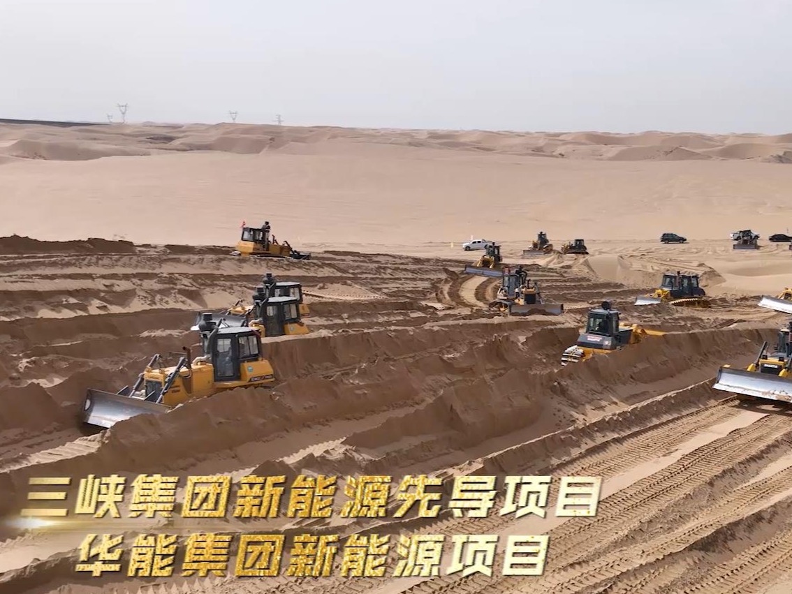 在位于内蒙古库布齐沙漠的光伏新能源先导工程建设现场,机械轰鸣声不绝于耳,上百辆山推推土机来回穿梭,井然有序地进行着场地平整作业,为这片沉寂千年的不毛之地带来前所未有的喧嚣生机。