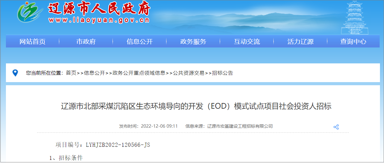 On December 6, 2022, Liaoyuan Municipal People's Government issued the public bidding announcement for the pilot project of ecological environment oriented development model in the northern coal mining subsidence area of Liaoyuan City. The tenderee: Liaoyuan Green Ecological Construction Investment Group Co., Ltd., with a total investment of 2.698 billion yuan.