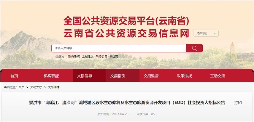 On April 20, 2023, the Yunnan Provincial Public Resources Trading Information Network released the bidding announcement for social investors of the water ecological restoration and water ecotourism resource development project in the urban area of the Lancang River and Liusha River in Jinghong City. Jinghong City State-owned Assets Investment Co., Ltd., the total investment of the project is 2.968 billion yuan.