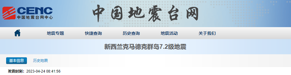 At around 8:41 on April 24, 2023, that is, at 12:41 noon on the 24th New Zealand time, an earthquake with a magnitude of 7.2 occurred in the waters near the Kermadec Islands in New Zealand, with a focal depth of 30 kilometers. Staff at the Chinese embassy in New Zealand said the island was largely uninhabited.