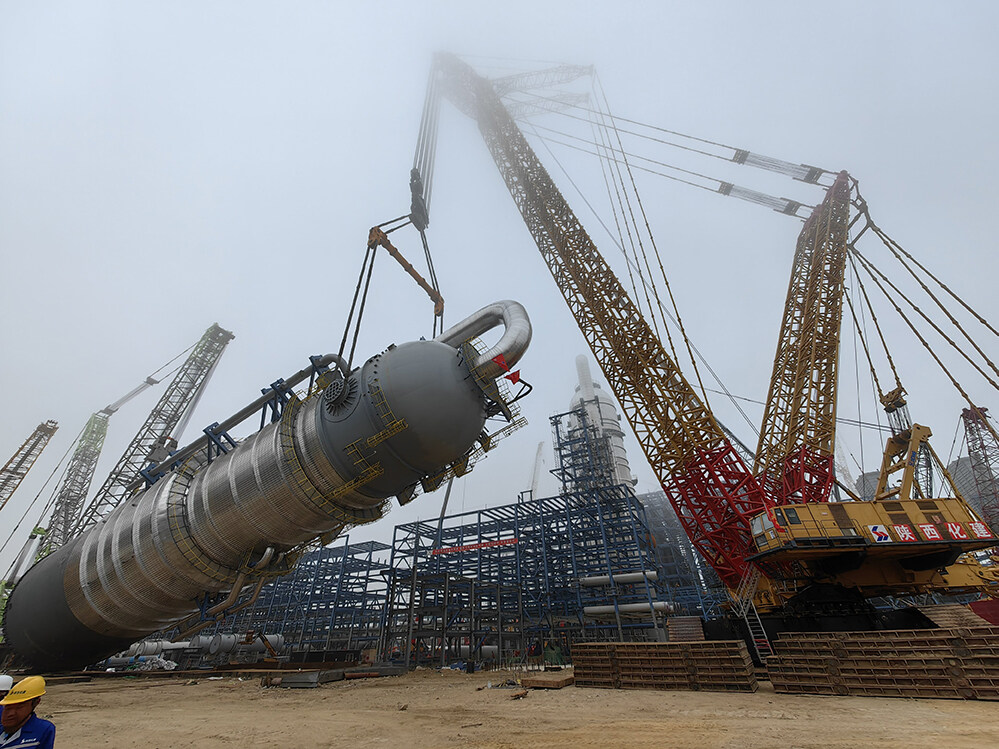 The tower is 65 meters high, 16 meters in diameter, and has a hoisting weight of 2158 tons. In order to ensure the successful completion of the hoisting task, the hoisting team of the project carried out the overall hoisting after the equipment was transported to the hoisting site as a whole, and the attached tower pipeline, ladder platform, heat preservation and other work were completed on the ground. The machine-lifting-single-machine lifting method consists of a 4,000-ton crawler crane for main hoisting, and a 2,000-ton crawler crane for tail lift delivery. During the hoisting process, after the equipment was gradually lifted up from the horizontal position, the 4,000-ton crawler crane performed luffing, slewing and other actions to successfully place the equipment safely on the foundation.