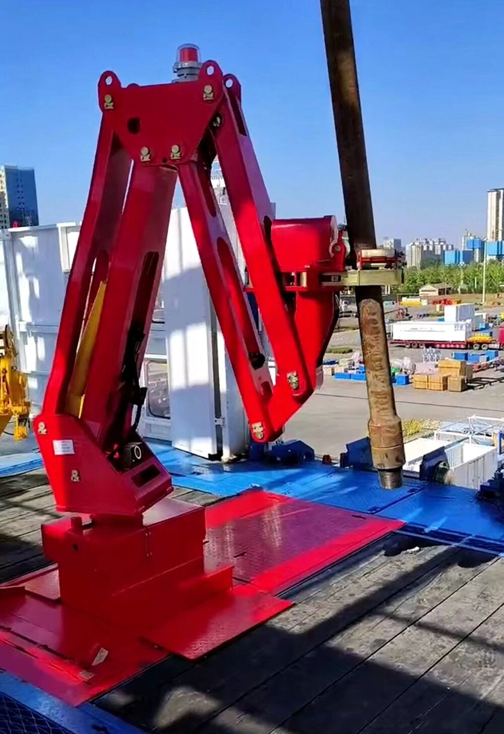 The iron driller can realize the automatic loading and unloading operations of drilling tools at the wellhead and rat hole positions, and at the same time integrates auxiliary functions such as stabbing, application of thread oil and mud blowout prevention. It solves the problems of manual assistance, low degree of automation, and high risk of wellhead operations in the process of root establishment, making-up and breaking-out of drilling tools, etc.