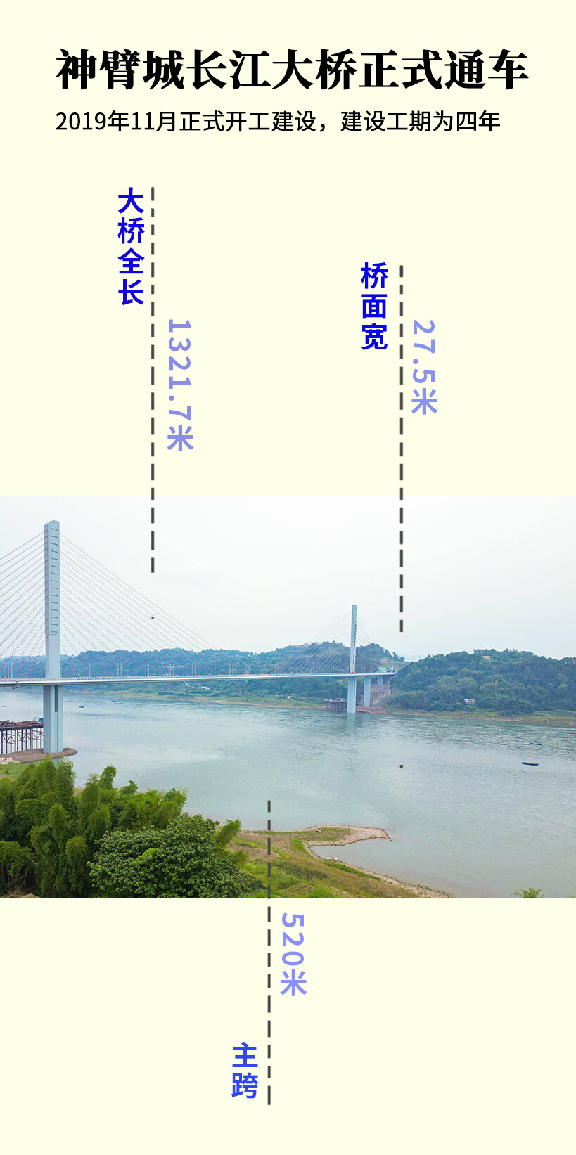 神臂城长江大桥为原泸州市合江新城过江通道,是泸州市重要的渡改桥项目之一,项目于2019年11月正式开工建设,大桥全长1321.7米,桥面宽27.5米,主跨520米。