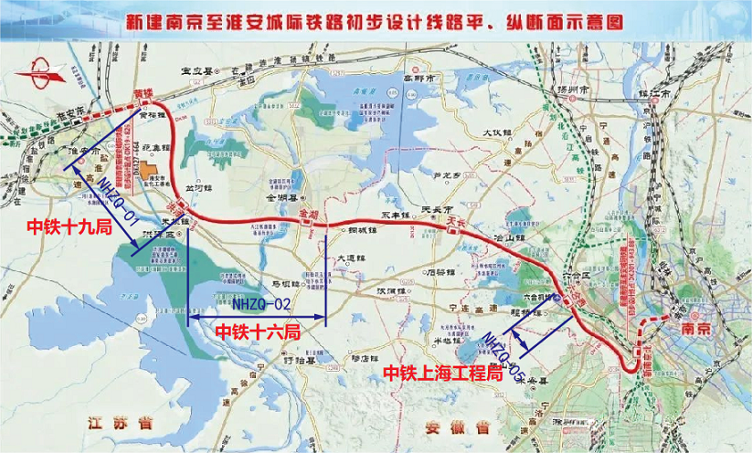 نانجينغ هواي السكك الحديدية بين المدن الجديدة من الشمال إلى الشرق من محطة هواي هواي ، هونغتسه مقاطعة ، مقاطعة جينهو ، مدينة تيانتشانغ فى مقاطعة انهوى ، ونانجينغ يوخه حي شمال محطة سكة حديد جديدة ، خط الطول 196.505km باستخدام ليان تشن هواي السكك الحديدية من الشرق إلى huanglou 17-14 كم ، خط جديد طول 179.365 كم ، طول نهر اليانغتسى وجيانغسو 133.893km ، وانهوى قسم طول 45.472km ، ما مجموعه liuze ، نانجينغ ، شمال غرب ، وهوايخه ، محطة سكة حديد .