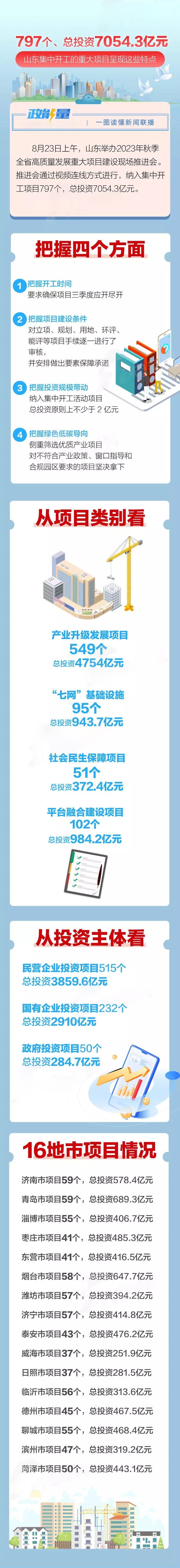 山东省紧抓绿色低碳热潮,重大项目建设加速发展。2023年8月23日上午,山东举行2023年秋季全省高质量发展重大项目建设现场推进会。记者从现场获悉,此次山东集中开工高质量发展重大项目797个,总投资达7054.3亿元,年度计划完成投资1584.9亿元。其中,投资10亿元以上项目达211个。