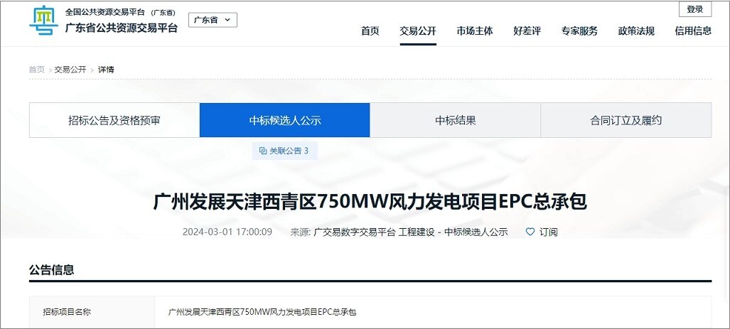 2024年3月1日,广州公共资源网发布了广州发展天津西青区750MW风力发电项目EPC总承包中标候选人公示,中国能建联合体中标大单!